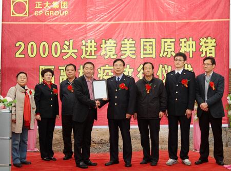 放行儀式上,陜西出入境檢驗檢疫局代表做了檢疫放行報告:“經過3個多月的隔離檢驗,正大集團農牧食品企業(yè)(中國區(qū))引進的2000頭原種豬完全符合安全檢疫標準,準予放行。”陜西出入境檢驗檢疫局代表為正大集團陜西區(qū)陳強總裁頒發(fā)了《種豬檢疫合格證書》。