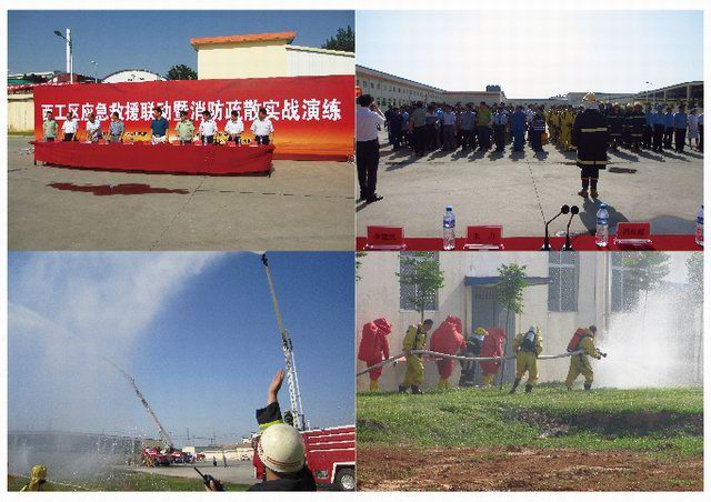洛陽市安監(jiān)局領(lǐng)導(dǎo)、洛陽市消防支隊領(lǐng)導(dǎo)、區(qū)領(lǐng)導(dǎo)迅速趕赴現(xiàn)場指揮救援,8臺消防車、2臺救護車在公安交警車開道下呼嘯而至,120名消氣防戰(zhàn)斗員訓(xùn)練有素展開救援,生產(chǎn)調(diào)整組、安全環(huán)保組、警戒保衛(wèi)組、設(shè)備搶修組、信息管理組共50人分別按預(yù)案井然有序開展現(xiàn)場工作。由于反應(yīng)迅速,處置得當(dāng),沒有造成周圍水體、空氣環(huán)境污染,沒有發(fā)生其他次生事故,1名中毒的現(xiàn)場操作人員得到及時救治。本次演練為力求貼近實戰(zhàn),對突發(fā)事故應(yīng)急處理真正起到指導(dǎo)和演練作用,改變以往演練模式,應(yīng)急指揮部演練中還臨時增設(shè)了演練科目。